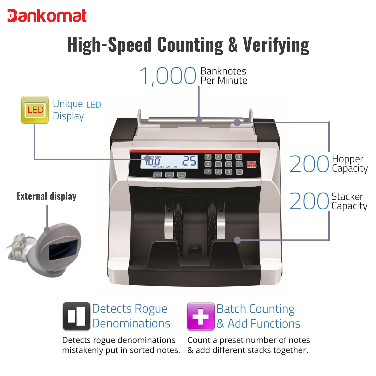 ✅ [COUNTING CAPACITY]- It’s Counting Speed is 1000Notes/Minute and it has 200 Notes Large Hopper and Stacker Capacity. This cash counting Machine Counts All Indian Currency 10,20,50,100,200,500. Counts Euro and Dollar also.