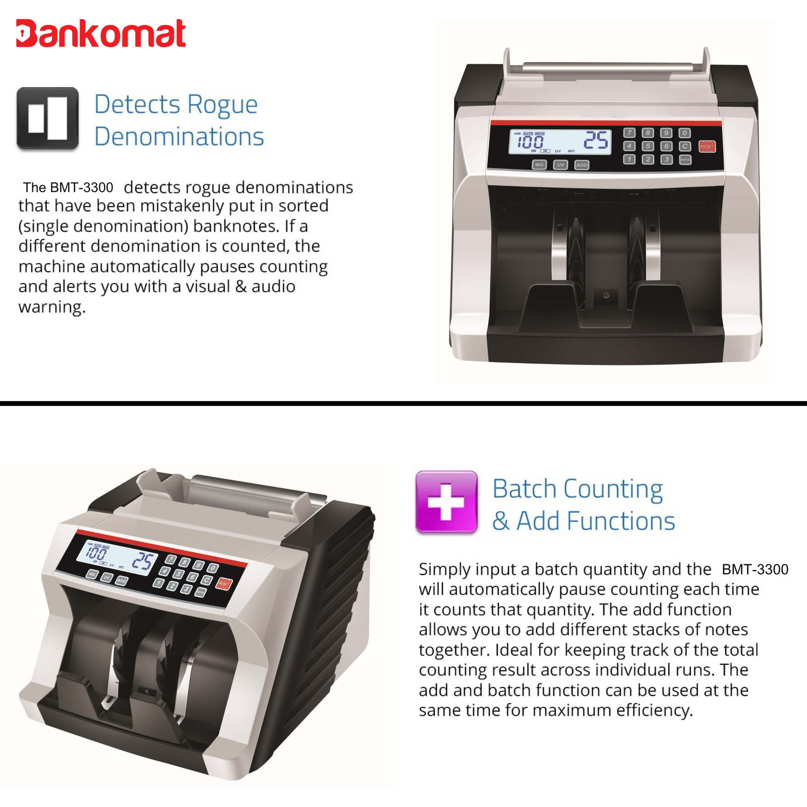 ✅ [ADD AND BATCH FUNCTION]- The machine counts and adds stacks of notes with no time. On replacing them with the next bundle, the count does not return to zero instead will ADD TO THE PREVIOUS COUNTED QUANTITY. Press the ‘ADD’ button again to turn the mode off. With Batch mode, you can make BUNDLES OF 100 NOTES or your desired quantity. When the “BATCH” button is pressed the batch number will be set to default 100. Press the Digits on keypad to reach your desired number.
